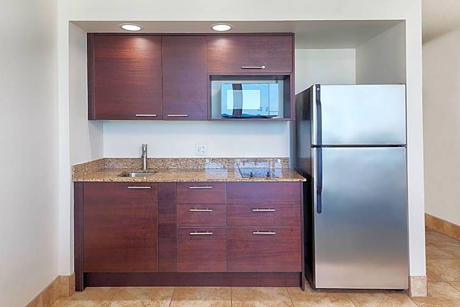 This room features a half-city, half-ocean view, flat-screen TV, and kitchenette.